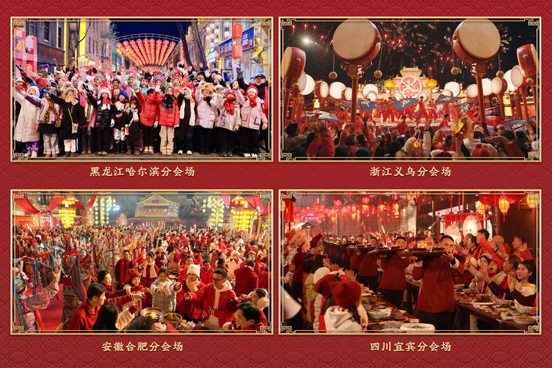 四地分会场各具风韵,从冰天雪地到长江之滨,从科创沃土到商贸新城,在新大众文艺的创新创造里展现各地年景。哈尔滨分会场融合表演唱、交响乐、芭蕾舞等表演形式,以故事化表达串联起城市地标,带观众沉浸式感受“东北老铁”的热情豪爽,传递“冰雪暖世界”的独特魅力。义乌分会场在全球数贸中心设立主舞台,表演融入拨浪鼓、婺剧、迎龙灯等地方元素;在热情四溢的歌舞中,中外文化相汇交融,四海畅联、八方通达的气象扑面而来。合肥分会场的水墨舞蹈、黄梅戏等接连登场,映照出徽风皖韵的风情;在主舞台骆岗公园上空,低空飞行器列阵翻飞,碰撞出科技与人文的璀璨火花。宜宾分会场以“万里长江第一城”的浩荡江景为幕,民俗活动“请春酒”贯穿全场,三江六岸欢歌笑语,家人围坐、燃面飘香、喜乐满堂。