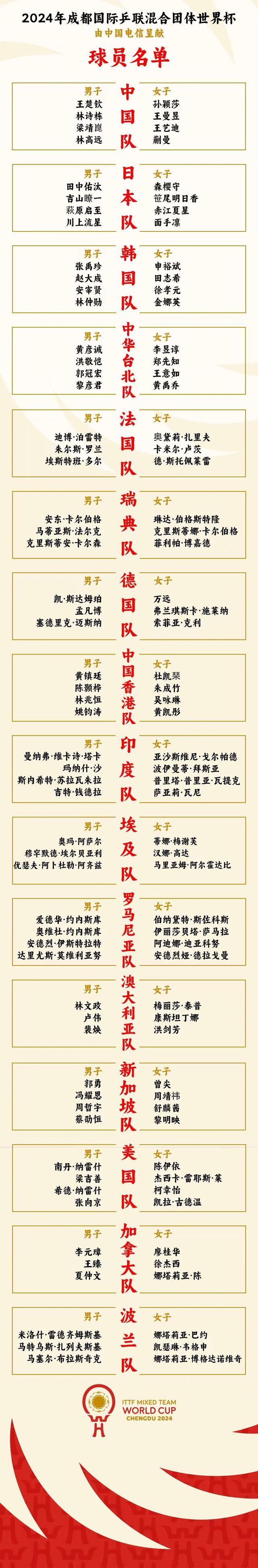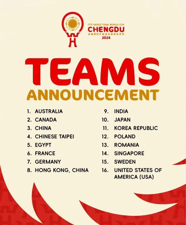 按照报名名单来看,本次混团世界杯共有16支球队参赛,分别是中国、日本、韩国、中国台北、法国、瑞典、德国、中国香港、印度、埃及、罗马尼亚、澳大利亚、新加坡、美国、加拿大、波兰。只是从球队名单来看,如果各协会全部以主力阵容参赛,那比赛的观赏性非常高,悬念也非常大!